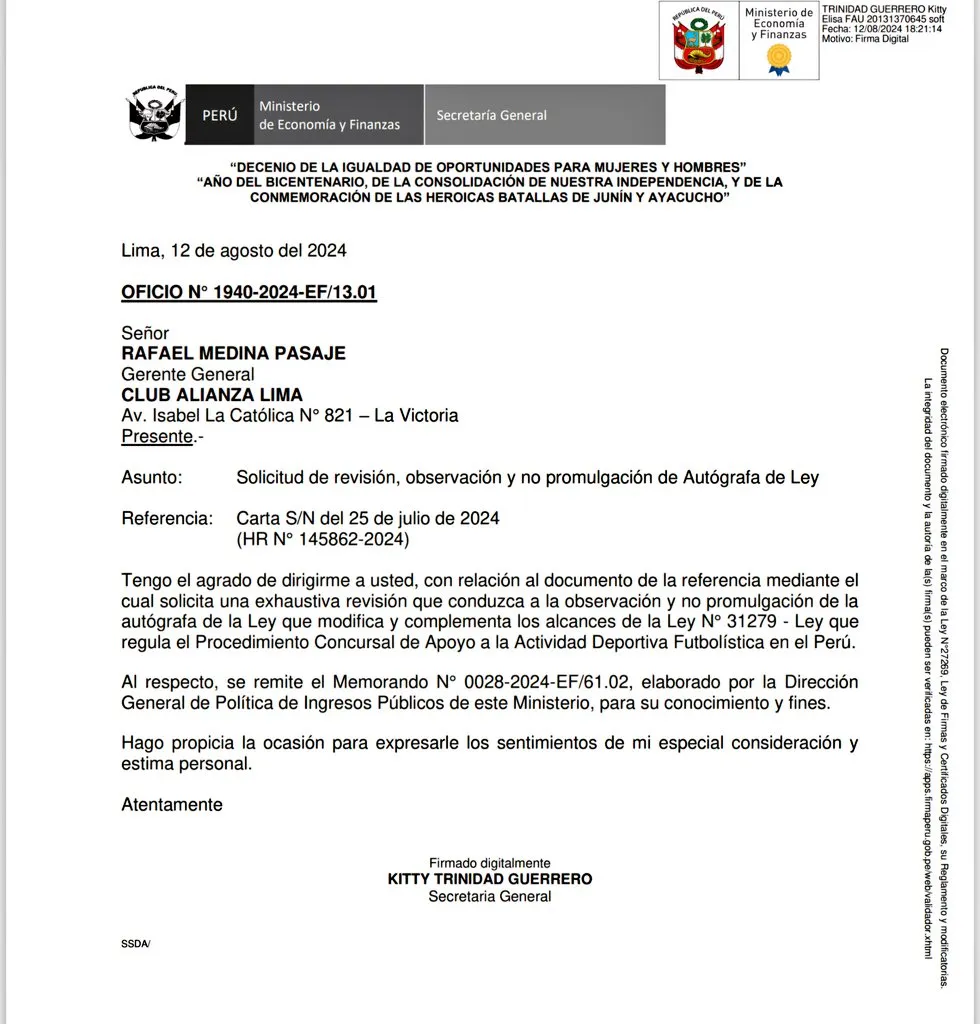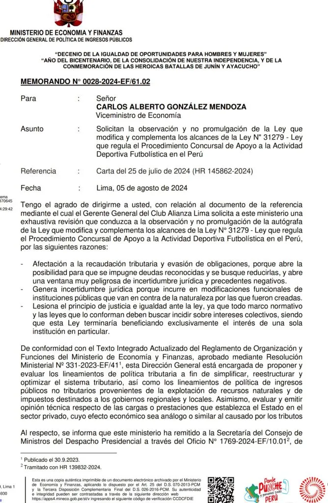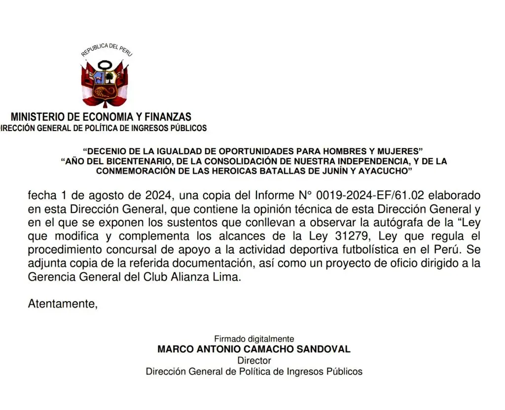 Lo que expone el comunicador es claro, hay una idea del club blanquiazul de cara a lo que vendrá más adelante. Con respecto al presente del equipo del pueblo en lo legal: “A continuación: El oficio remitido por la secretaría del ministerio al gerente general de Alianza Lima, Rafael Medina. Así mismo, el memorándum del ministerio a Carlos González, Viceministro de Economía, donde se confirma la observación de la Ley a través de un oficio remitido a la Secretaría de Consejo de Ministros del Despacho Presidencial”.