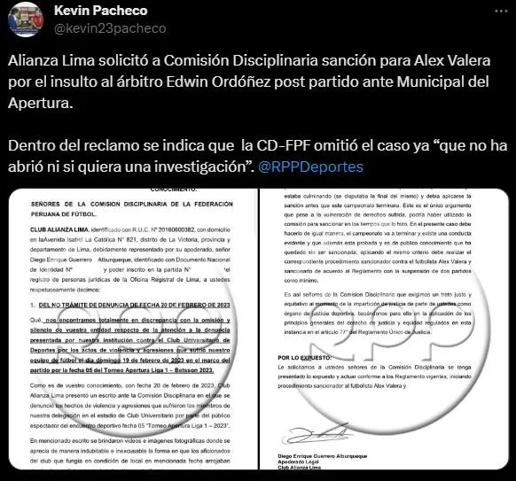 Kevin Pacheco de RPP Noticias nos cuenta lo que pasó en este sentido: “Alianza Lima solicitó a Comisión Disciplinaria sanción para Alex Valera por el insulto al árbitro Edwin Ordóñez post partido ante Municipal del Apertura. Dentro del reclamo se indica que la CD-FPF omitió el caso, ya que “no abrió ni siquiera una investigación””.