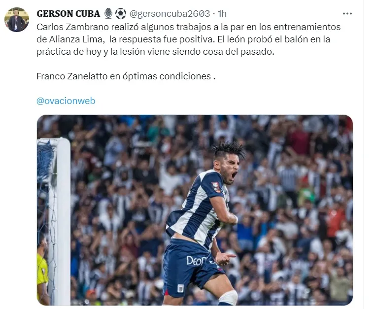 Gerson Cuba en Twitter: “Carlos Zambrano realizó algunos trabajos a la par en los entrenamientos de Alianza Lima, la respuesta fue positiva. El ‘León’ probó el balón en la práctica de hoy y la lesión viene siendo cosa del pasado”.