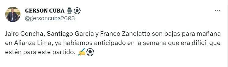 “Jairo Concha, Santiago García y Franco Zanelatto son bajas para mañana en Alianza Lima, ya habíamos anticipado en la semana que era difícil que estén para este partido”, escribió el comunicador en su cuenta oficial de Twitter.