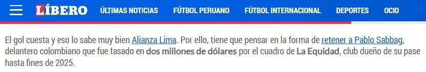 Pero en Alianza Lima son conscientes que es el jugador que necesitan en la delantera y no tendrían problema en pagarle dos millones de dólares a La Equidad por el pase de Pablo Sabbag.