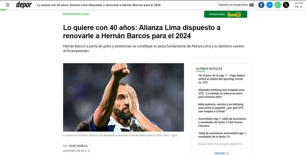 “Mientras tanto, Barcos, quien ya tiene 14 goles en la Liga 1 Betsson, lidera la lucha por el anhelado tricampeonato. Este jueves Alianza jugará una nueva ‘final’ esta vez ante FBC Melgar en Matute y el ‘Pirata’ de los grones, autor de los dos goles para la victoria ante Mannucci en Trujillo, estará listo para comandar la ofensiva íntima”. Como contexto, de lo que vive hoy por hoy Alianza Lima con su crack absoluto: Hernán Barcos.