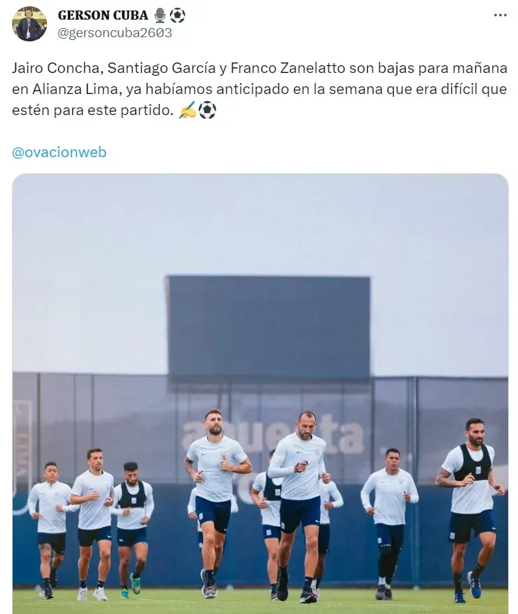 De esta forma, las 5 bajas confirmadas de Alianza Lima son Jairo Concha, Ángelo Campos, Ricardo Lagos, Santiago García y Franco Zanelatto. Con ellos, ninguno de los jugadores podrá estar ante Alianza Atlético.