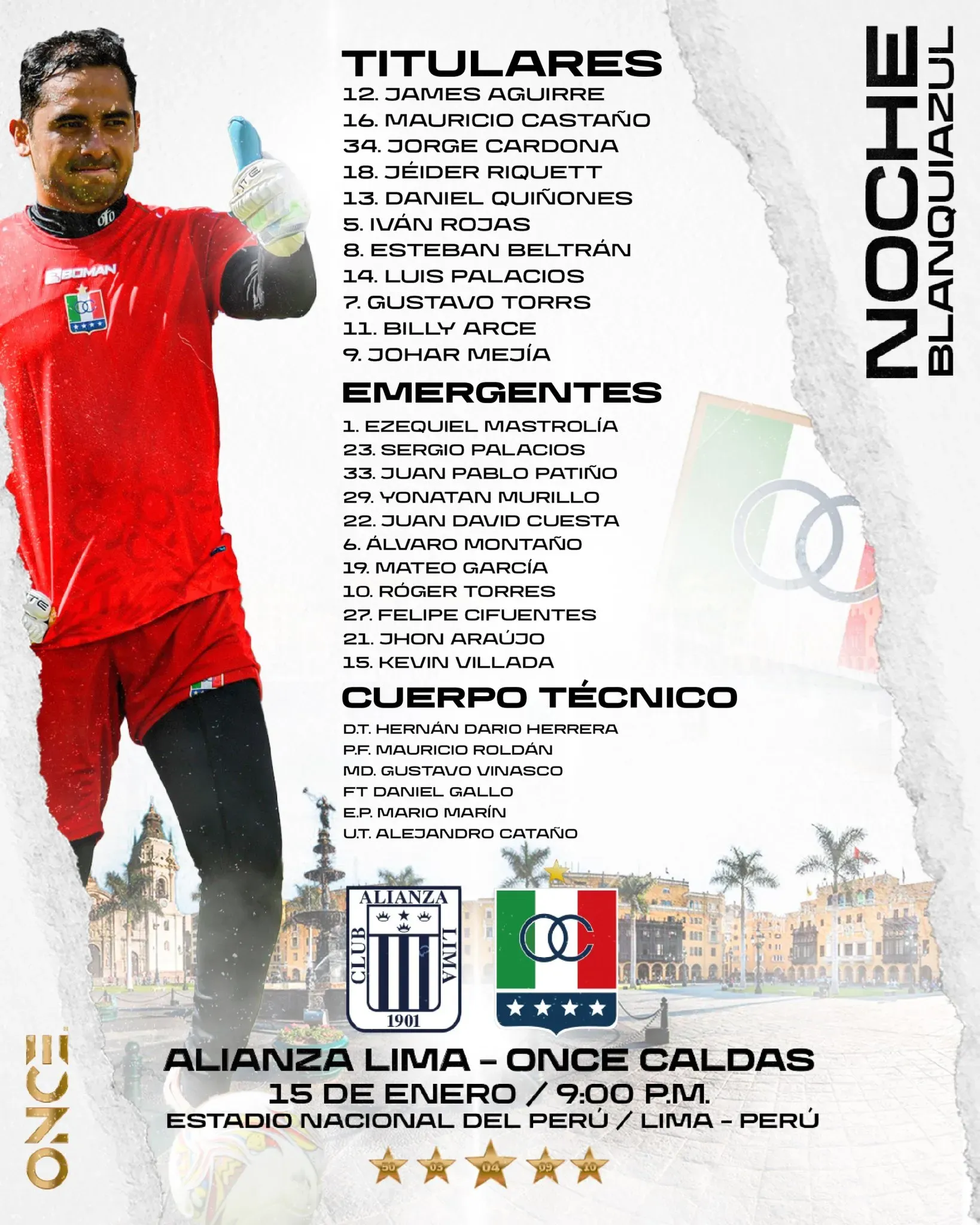 Frente a Once Caldas estarán jugando: Angelo Campos, Juan Pablo Freytes, Aldair Fuentes, Jiovany Ramos, Ricardo Lagos, Jesús Castillo, Adrián Arregui, Catriel Cabellos, Kevin Serna, Hernán Barcos y Cecilio Waterman.
