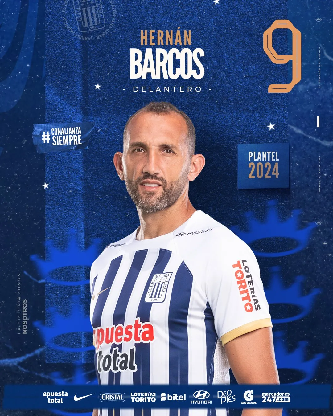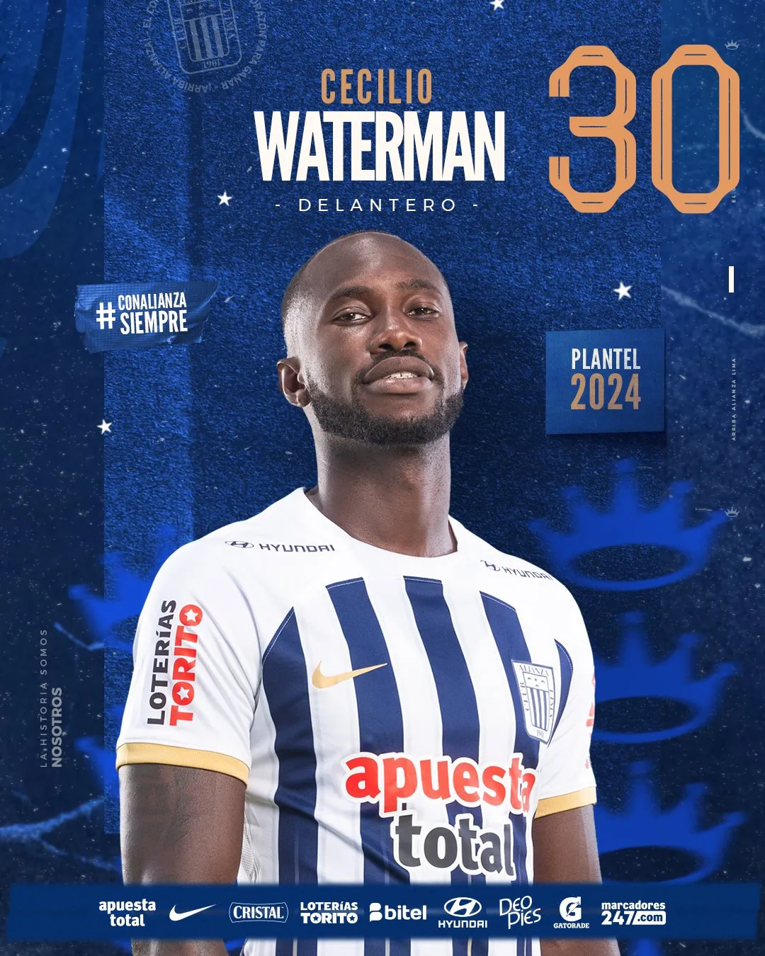 Alianza Lima 2024 - Delanteros: 30 Cecilio Waterman 22 Víctor Guzmán 9 Hernán Barcos 19 Pablo Sabbag *