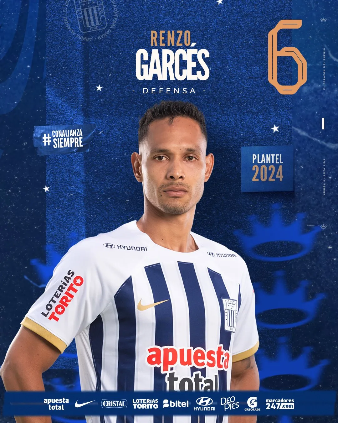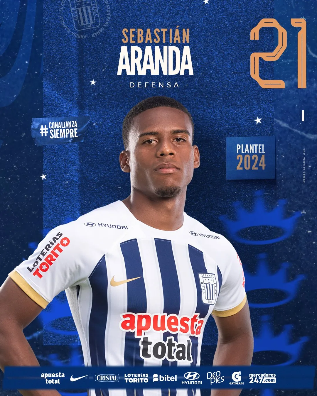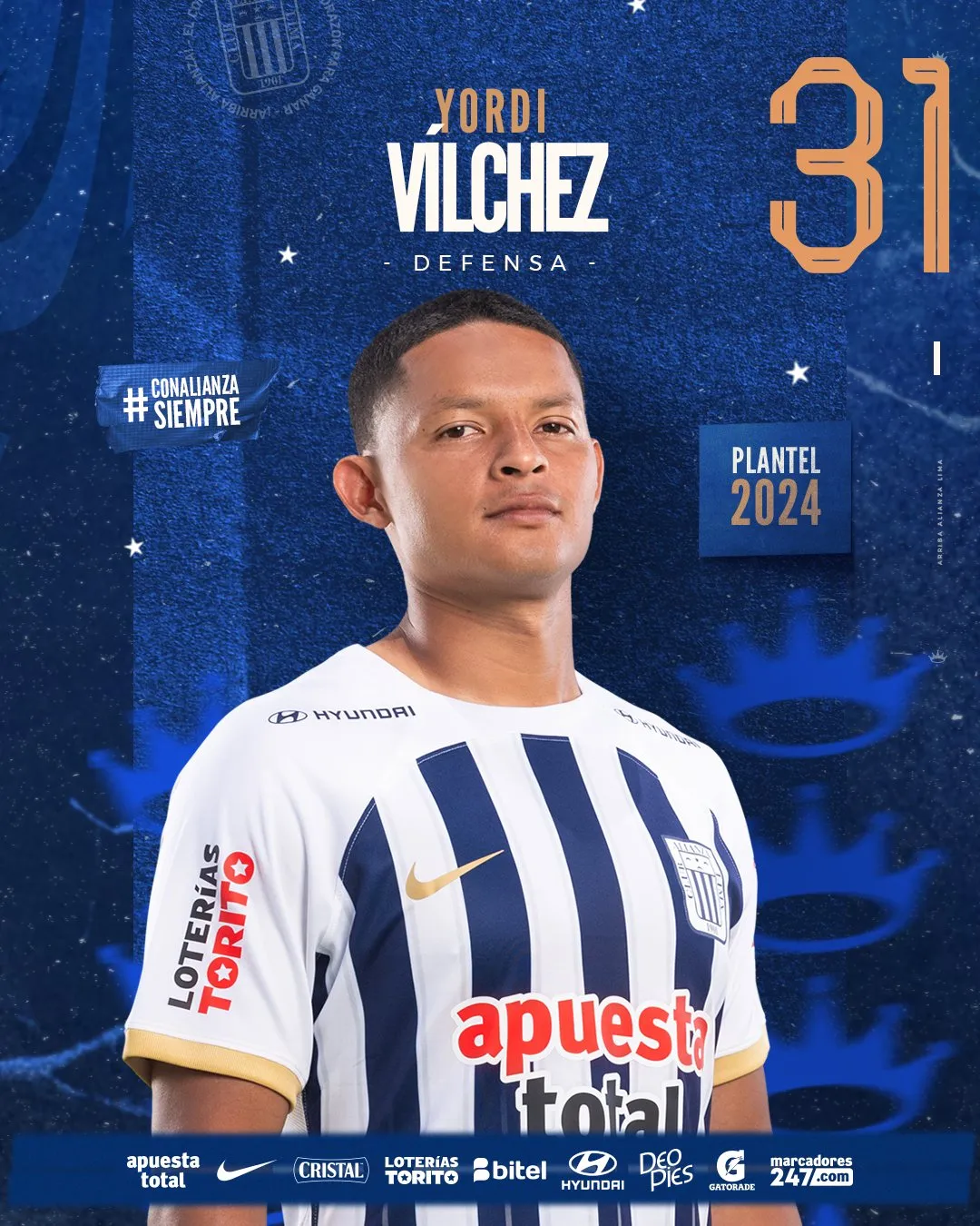 Alianza Lima 2024 - Defensas: 31 Yordi Vílchez 25 Marco Huamán 4 Nicolás Amasifuén 29 Jiovany Ramos 21 Sebastián Aranda 23 Brian Arias 6 Renzo Garcés 2 Juan Pablo Freytes 20 Aldair Fuentes 13 Ricardo Lagos