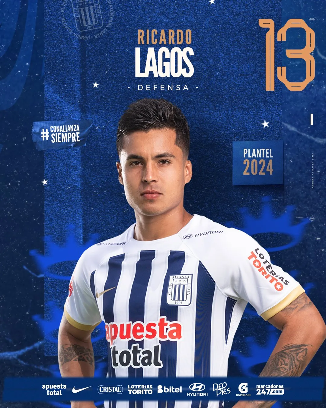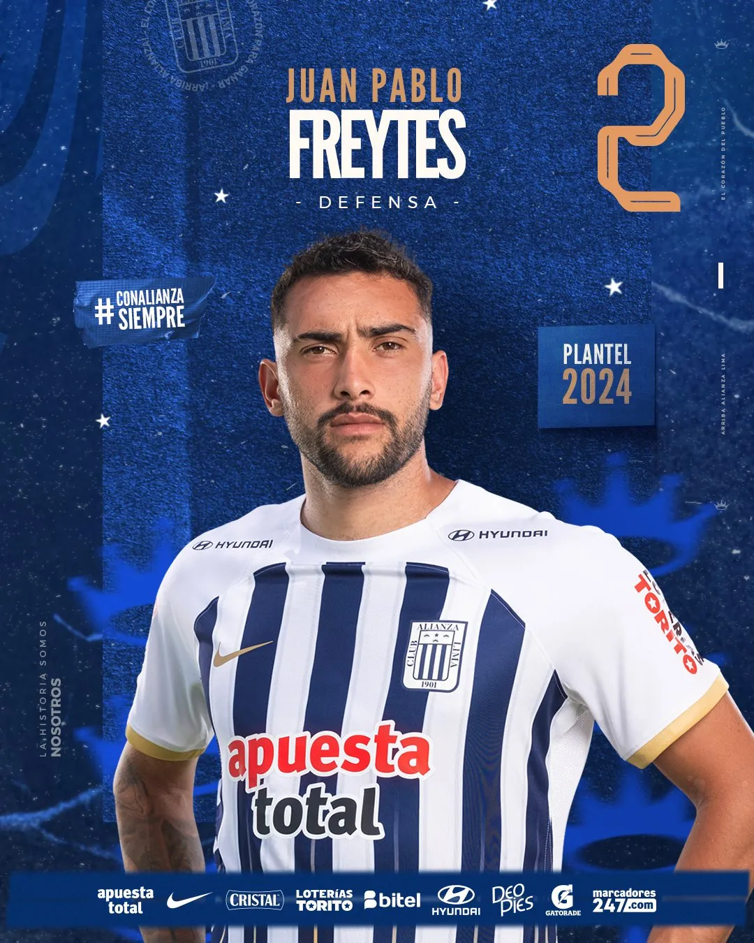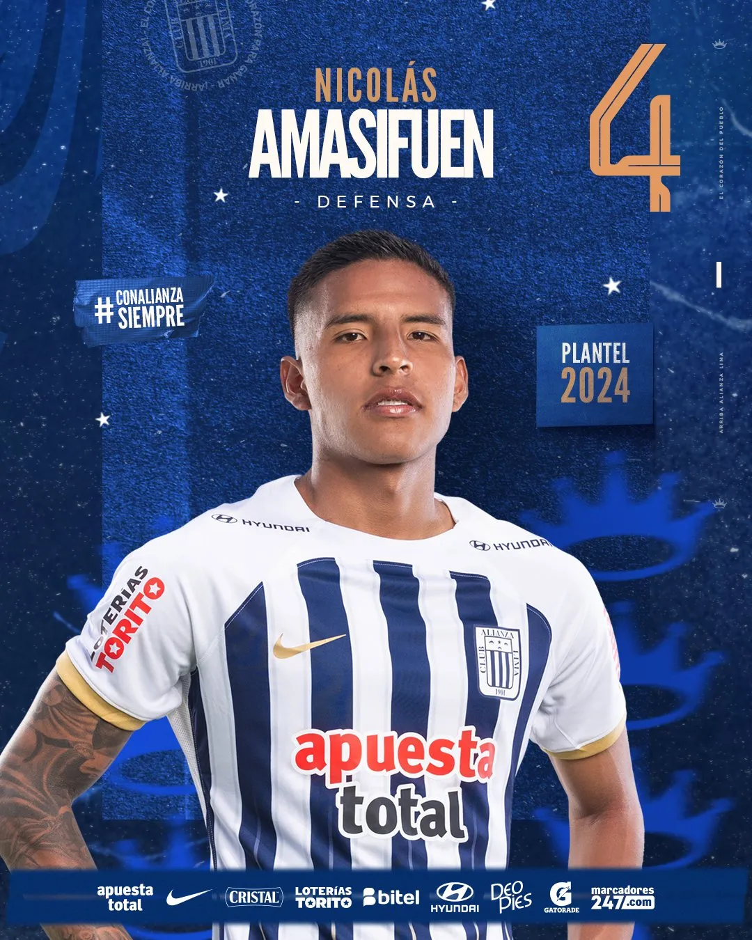 Alianza Lima 2024 - Defensas: 31 Yordi Vílchez 25 Marco Huamán 4 Nicolás Amasifuén 29 Jiovany Ramos 21 Sebastián Aranda 23 Brian Arias 6 Renzo Garcés 2 Juan Pablo Freytes 20 Aldair Fuentes 13 Ricardo Lagos