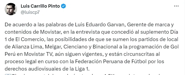 “La situación está circunscrita al proceso legal en curso con la Federación Peruana de Fútbol por los derechos audiovisuales de la Liga 1”.