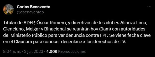El periodista de Ovación Web, Carlos Benavente, reveló: “Titular de ADFP, Óscar Romero, y directivos de los clubes Alianza Lima, Cienciano, Melgar y Binacional se reunirán hoy (9am) con autoridades del Ministerio Público para ver denuncia contra FPF. Se viene fecha clave en el Clausura para conocer desenlace por los derechos de TV”.