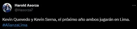 Así lo cuenta el periodista deportivo, Harold Asorza, en su cuenta de Twitter: “Kevin Quevedo y Kevin Serna, el próximo año ambos jugarán en Lima. Alianza Lima”. Siguiendo el camino de los dos últimos partidos de Universitario de Deportes, junto a los responsables de su crisis deportiva.