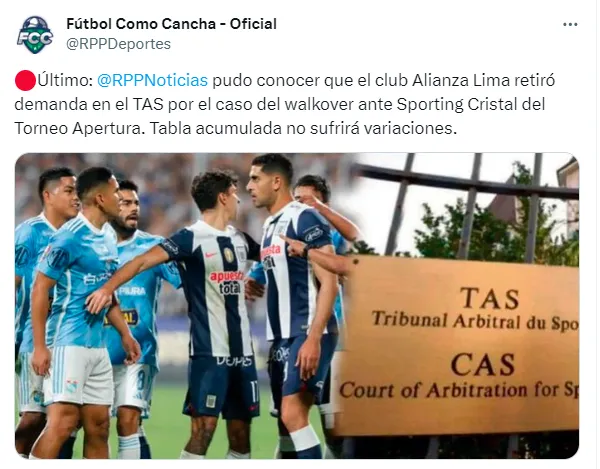 RPP escribió para todas sus multiplataformas: “RPP pudo conocer que el club Alianza Lima retiró la demanda en el TAS por el caso del Walk Over ante Sporting Cristal en el Torneo Apertura. La tabla acumulada no sufrirá variaciones”.