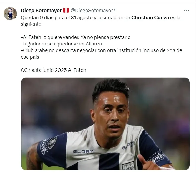 En ese sentido, el periodista Diego Sotomayor indicó cuál es exactamente la situación de Alianza Lima, Christian Cueva y Al Fateh: “Quedan 9 días para el 31 de agosto y la situación es la siguiente: Al Fateh lo quiere vender. Jugador quiere quedarse en Alianza”, comentó.