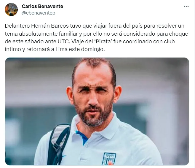 “Delantero Hernán Barcos tuvo que viajar fuera del país para resolver un tema absolutamente familiar y por ello no será considerado para el choque de este sábado ante UTC. Viaje del ‘Pirata’ fue coordinado con club íntimo y retornará a Lima este domingo”, escribió el comunicador en su cuenta oficial de Twitter.