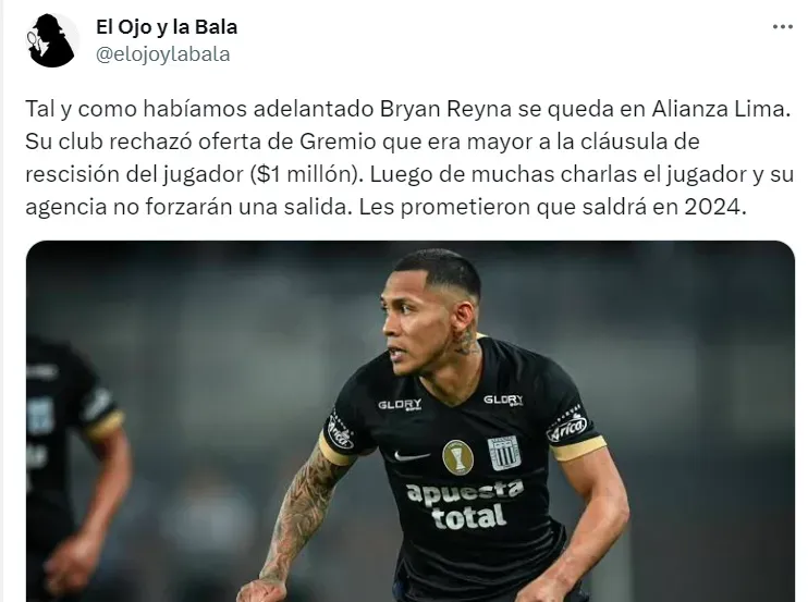 “Tal y como habíamos adelantado, Bryan Reyna se queda en Alianza Lima. Su club rechazó la oferta de Gremio, que era mayor a la cláusula de rescisión del jugador ($1 millón). Luego de muchas charlas, el jugador y su agencia no forzará una salida. Les prometieron que saldrá en 2024”, escribió el medio deportivo, El Ojo y la Bala.