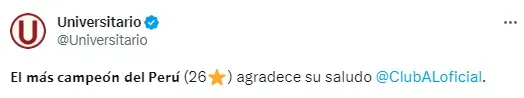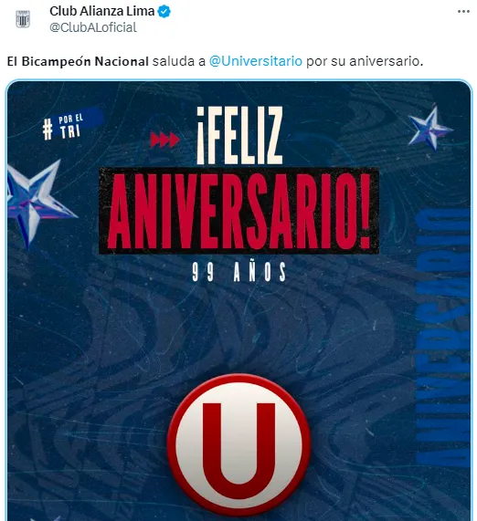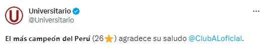 Es que los blanquiazules postearon en sus redes sociales: “”El Bicampeón Nacional saluda a Universitario por su aniversario”, a lo que recibió por respuesta por parte de los merengues fue: “El más campeón del Perú agradece su saludo, Club Alianza Lima”.