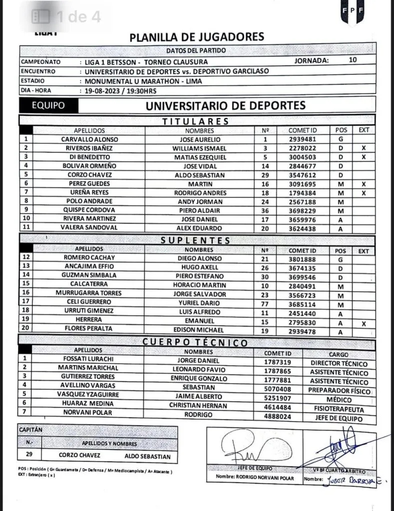 El once de la U va de la siguiente manera: José Carvallo/Aldo Corzo, Williams Riveros, Matías Di Benedetto/Andy Polo, Martín Pérez Guedes, Rodrigo Ureña, Piero Quispe, José Bolívar/ José Rivera y Alex Valera.