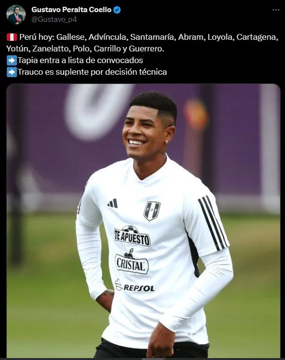 Añade también Gustavo Peralta que dos jugadores de espalda ancha en la Selección Peruana tienen diferentes destinos: “Tapia entra a lista de convocados. Trauco es suplente por decisión técnica”. Renato del Celta de Vigo se mantiene a la expectativa de lo que pueda pasar. Mientras que, Miguel se deberá ir a las gradas.