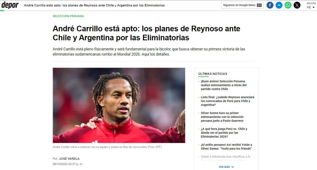 “Depor pudo conocer de buena fuente que su lesión al tendón de la corva ya no existe y que no fue necesario que se opere como anunció su nuevo club el pasado 24 de septiembre”. Explicó en su reciente artículo el medio de comunicación, en referencia al problema físico que tuvo André Carrillo hace unas semanas.