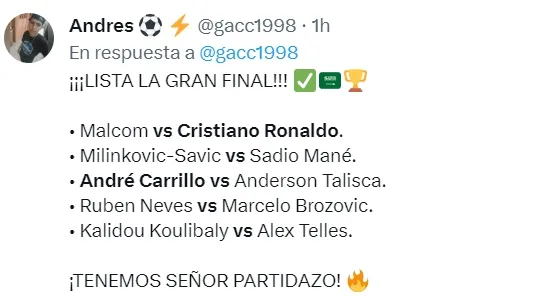 Enfrentándose así dos clubes de la Saudi Professional League en la gran final del Campeonato de Clubes Árabes, el peruano André Carrillo tendrá un duelo ante el portugués Cristiano Ronaldo.