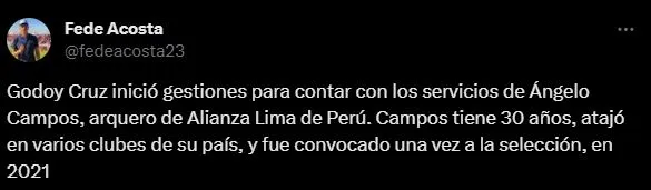 El periodista Federico Acosta lanzó el detalle de esta posible transacción. Despertando a todo el universo blanquiazul, pues se trata de uno de sus mejores futbolistas: “Godoy Cruz inició gestiones para contar con los servicios de Ángelo Campos, arquero de Alianza Lima de Perú. Campos tiene 30 años, atajó en varios clubes de su país, y fue convocado una vez a la selección, en 2021”.