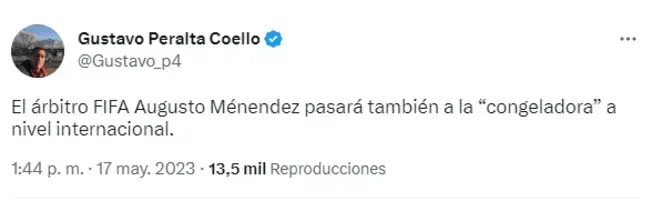“El árbitro FIFA Augusto Ménendez pasará también a la “congeladora” a nivel internacional”, escribió el comunicador a través de su cuenta oficial de Twitter.