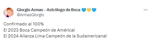 “¡Confirmado al 100% El 2023 Boca Campeón de América! ¡El 2024 Alianza Lima Campeón de la Sudamericana!”, escribió en su cuenta oficial de X (antes llamado Twitter).