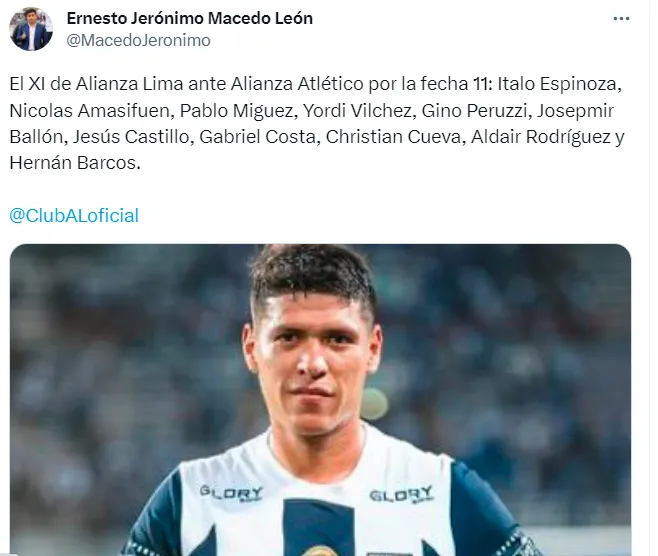 Con todo esto, Mauricio Larriera ha preparado un once que los ayude a lograr los objetivos de esta tarde que va de la siguiente manera: Italo Espinoza, Nicolas Amasifuen, Pablo Miguez, Yordi Vilchez, Gino Peruzzi, Josepmir Ballón, Jesús Castillo, Gabriel Costa, Christian Cueva, Aldair Rodríguez y Hernán Barcos. Así informó el periodista deportivo Jerónimo Macedo.
