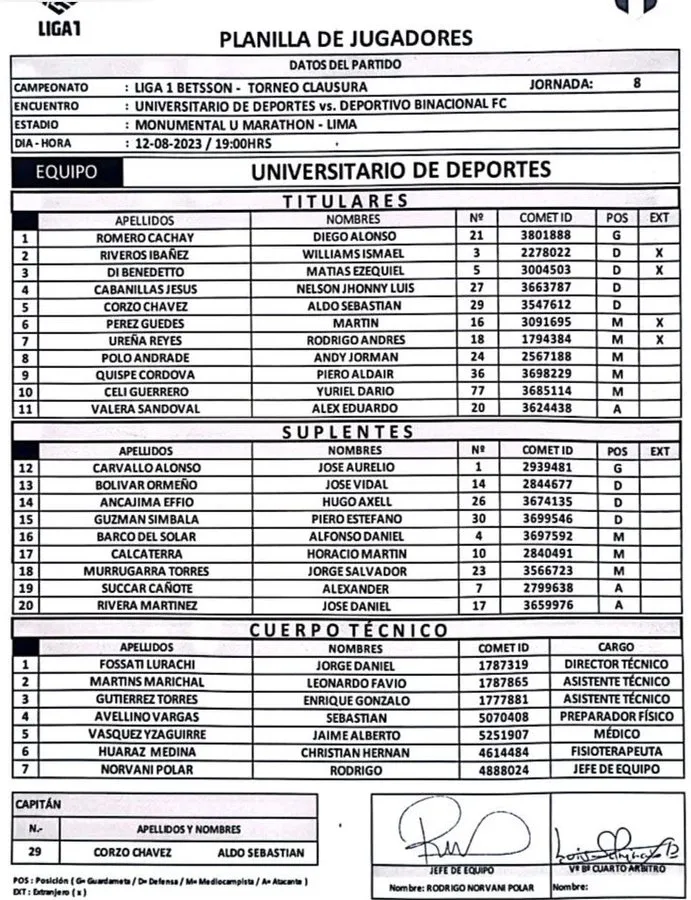 El once de la U va de la siguiente manera: Diego Romero/Aldo Corzo, Williams Riveros, Matías Di Benedetto/Andy Polo, Martín Pérez Guedes, Rodrigo Ureña, Piero Quispe, Nelson Cabanillas/ Yuriel Celi y Alex Valera.