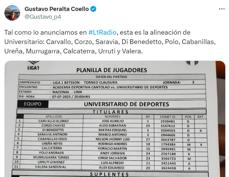 “Tal como lo anunciamos en L1 Radio, esta es la alineación de Universitario: Carvallo, Corzo, Saravia, Di Benedetto, Polo, Cabanillas, Ureña, Murrugarra, Calcaterra, Urruti y Valera”, escribió el comunicador en su cuenta de twitter.