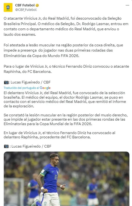 También mencionando Brasil al reemplazante del delantero Vinícius Júnior, el comunicado reveló que el crack será sustituido por otro monstruo: Raphinha del FC Barcelona.