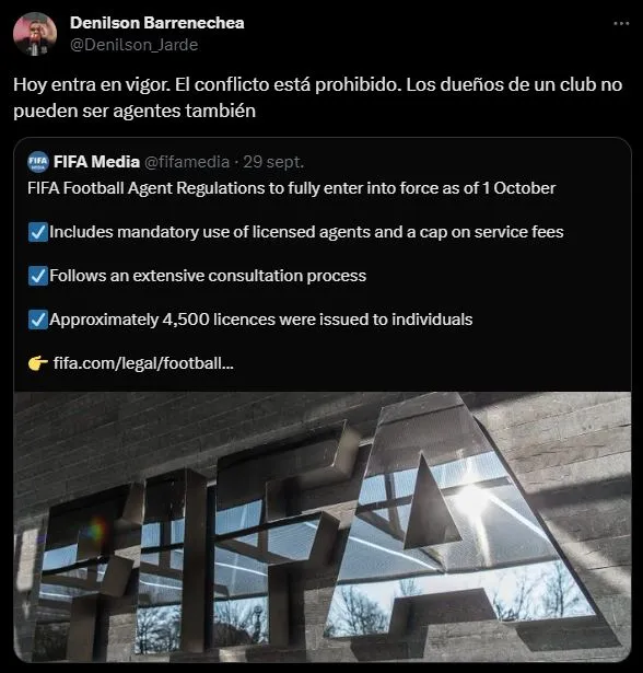 El periodista de A Presión Radio, Denilson Barrenechea, alertó a todos en su cuenta de Twitter con el siguiente aviso, y desde ahí se tejieron diversos subtemas para llegar a la matriz del problema real: “Hoy entra en vigor. El conflicto está prohibido. Los dueños de un club no pueden ser agentes también”.