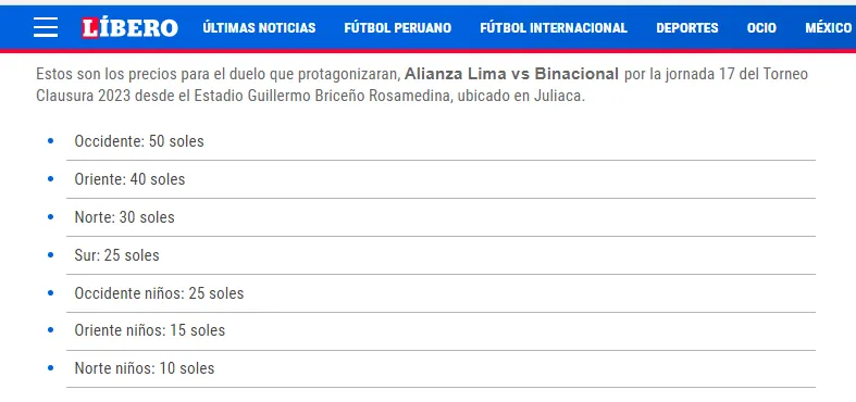 Según el diario Líbero, los precios de las entradas son los siguientes: Occidente: 50 soles, Oriente: 40 soles, Norte: 30 soles, Sur: 25 soles. Para niños, los precios son más bajos: Occidente niños: 25 soles, Oriente niños: 15 soles, Norte niños: 10 soles.