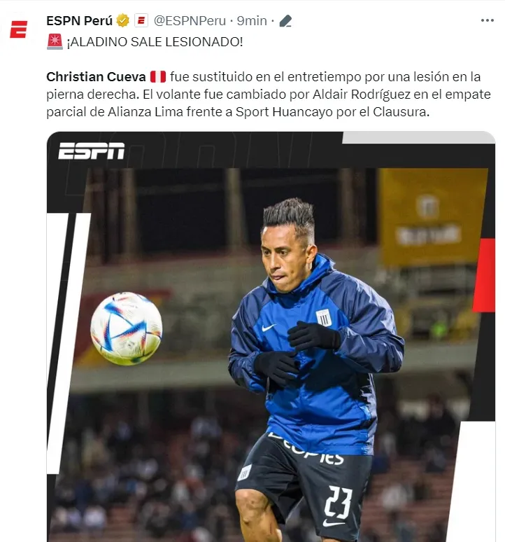 Sucediendo una situación complicada en el entretiempo del cotejo entre Alianza Lima ante Sport Huancayo, el volante Christian Cueva fue cambiado luego de no poder continuar en el partido.
