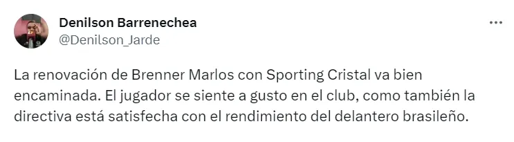 Denilson Barrenechea informó: “La renovación de Brenner Marlos con Sporting Cristal va bien encaminada. El jugador se siente a gusto en el club, como también la directiva está satisfecha con el rendimiento del delantero brasileño”.