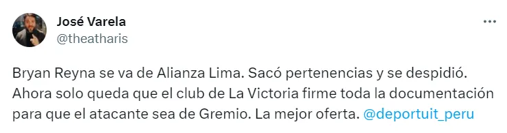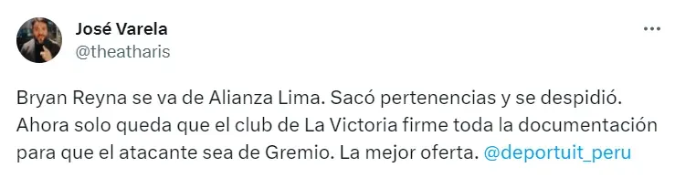 “Bryan Reyna se va de Alianza Lima. Sacó pertenencias y se despidió. Ahora solo queda que el club de La Victoria firme toda la documentación para que el atacante sea de Gremio. La mejor oferta”, escribió el comunicador.