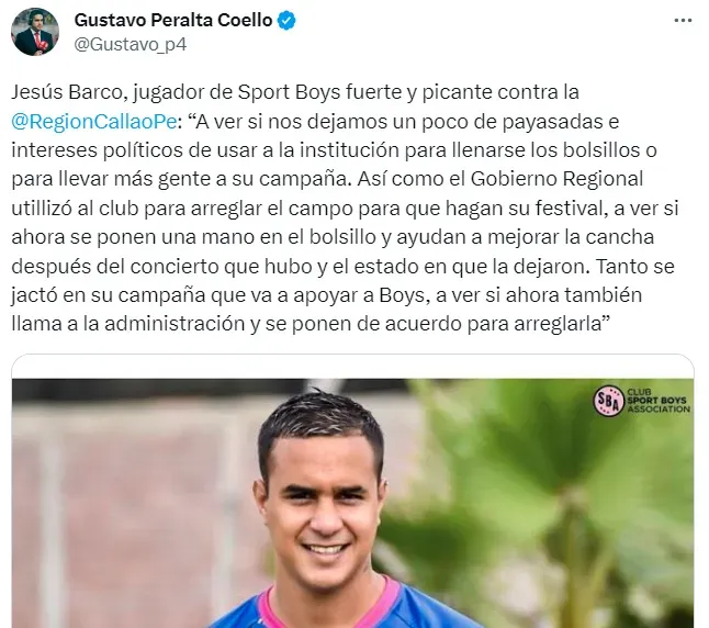 “A ver si nos dejamos un poco de payasadas e intereses políticos de usar a la institución para llenarse los bolsillos o para llevar más gente a su campaña. Así como el Gobierno Regional utilizó al club para arreglar el campo para que hagan su festival, a ver si ahora se ponen una mano en el bolsillo y ayudan a mejorar la cancha después del concierto que hubo y el estado en que la dejaron. Tanto se jactó en su campaña que va a apoyar a Boys, a ver si ahora también llama a la administración y se ponen de acuerdo para arreglarla”, mencionó el jugador de la misilera en conferecia de prensa.