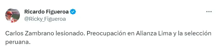 “Carlos Zambrano lesionado. Preocupación en Alianza Lima y la selección peruana”, escribió el comunicador en su cuenta oficial de Twitter.