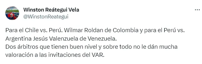 “Para el Chile vs. Perú. Wilmar Roldan de Colombia y para el Perú vs. Argentina Jesús Valenzuela de Venezuela. Dos árbitros que tienen buen nivel y sobre todo no le dan mucha valoración a las invitaciones del VAR”, informó Winston Reátegui, exárbitro y actual comentarista de fútbol.