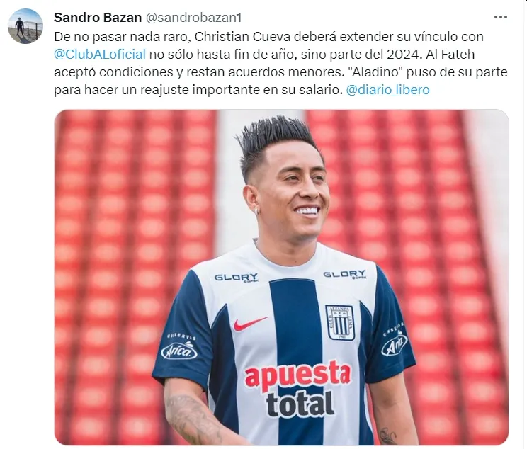 Así lo informó el periodista Sandro Bazán. Empleando sus redes sociales, el hombre de prensa confirmó que Christian Cueva permanecerá en Alianza Lima tras llegar a un acuerdo con Al Fateh. Prolongando así su estadía, el principal objetivo es el tricampeonato.
