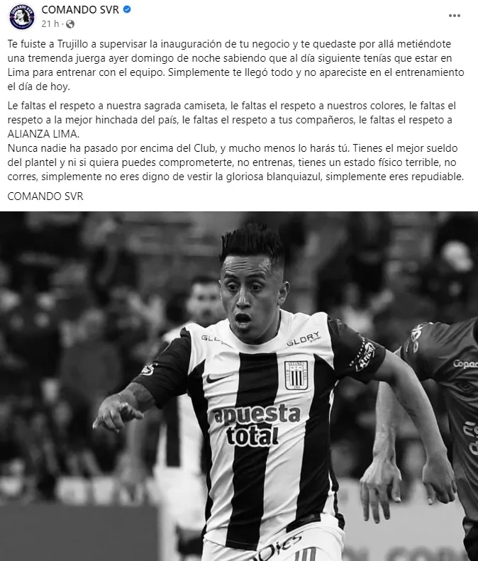 Haciendo una fuerte advertencia vía redes sociales, el Comando Svr, la barra popular de Alianza Lima, se refirió a Christian Cueva.
