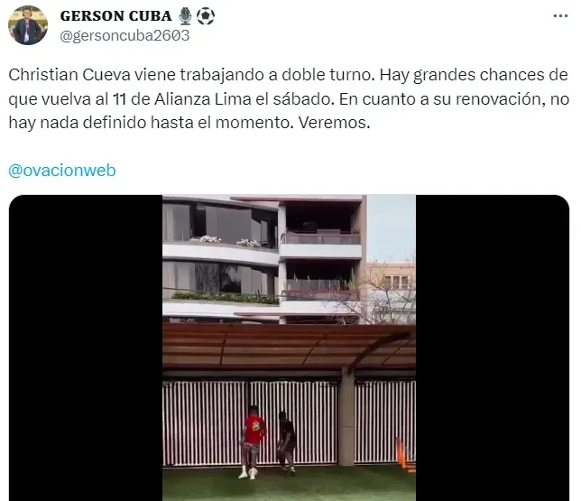 “Christian Cueva viene trabajando a doble turno. Hay grandes chances de que vuelva al 11 de Alianza Lima el sábado. En cuanto a su renovación, no hay nada definido hasta el momento. Veremos”, escribió el comunicador en su cuenta oficial de Twitter.
