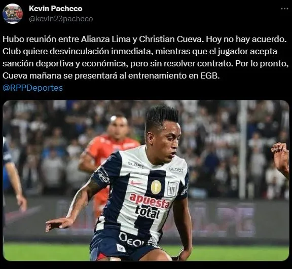 Kevin Pacheco nos da más luces sobre este tema: “Hubo reunión entre Alianza Lima y Christian Cueva. Hoy no hay acuerdo. Club quiere desvinculación inmediata, mientras que el jugador acepta sanción deportiva y económica, pero sin resolver contrato. Por lo pronto, Cueva mañana se presentará al entrenamiento en EGB”.