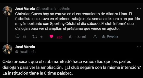 Para tomar mayor relevancia a lo dicho, tomamos los detalles del periodista José Varela: “Christian Cueva hoy no estuvo en el entrenamiento de Alianza Lima. El futbolista no estuvo en el primer trabajo de la semana de cara a un partido muy importante con Sporting Cristal el día sábado”.