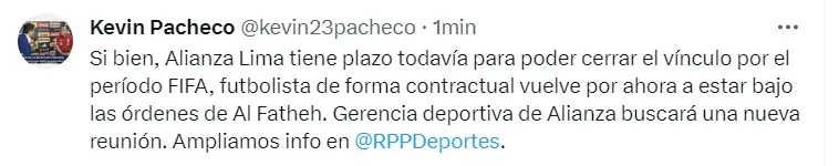 “Si bien, Alianza Lima tiene plazo todavía para poder cerrar el vínculo por el período FIFA, futbolista de forma contractual vuelve por ahora a estar bajo las órdenes de Al Fateh. Gerencia deportiva de Alianza buscará una nueva reunión”.