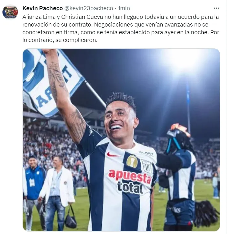 Con este nuevo panorama, técnicamente venció la cesión entre Christian Cueva y Alianza Lima, la cual caducaba el jueves 31 de agosto. Ahora, Kevin Pacheco explicó que existe un periodo de gracia para continuar negociando, pero tendrán que cerrar pronto.