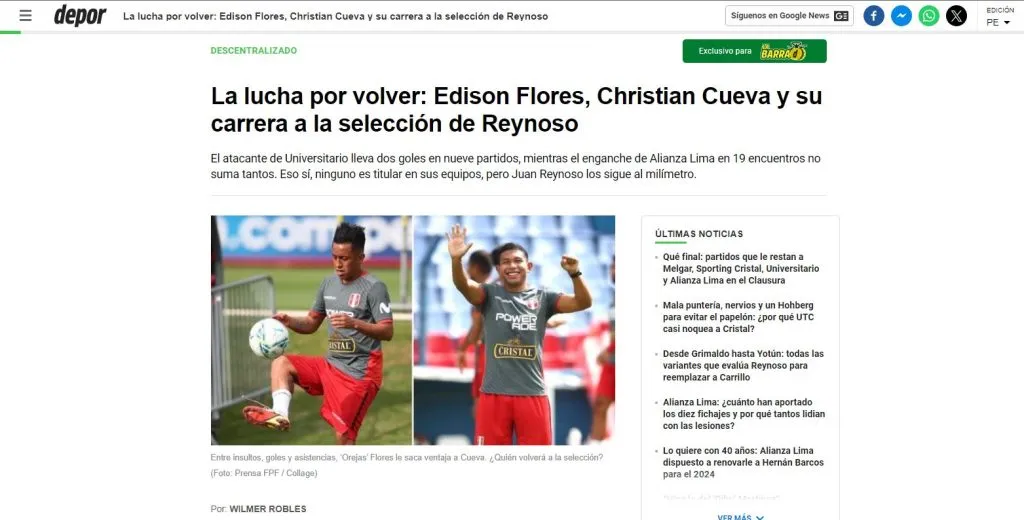 “Por una parte, el segundo atacante en el equipo del técnico uruguayo Jorge Fossati ha venido con un fútbol y físico progresivo de menos a más. El mismo ‘Orejas’, post gol y triunfo frente a los rosados, expresó su deseo de seguir trabajando para ser tomado en cuenta por Juan Máximo Reynoso. No se quiere perder esta nueva fecha doble”. El primer caso, como se ve, es Edison Flores, quien poco a poco desea regresar al más alto nivel.