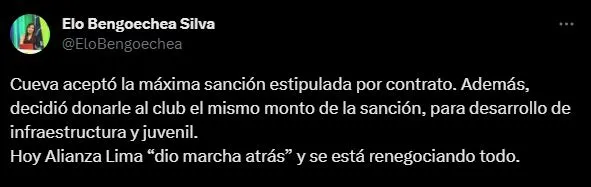 “Cueva aceptó la máxima sanción estipulada por contrato. Además, decidió donarle al club el mismo monto de la sanción, para desarrollo de infraestructura y juvenil. Hoy Alianza Lima “dio marcha atrás” y se está renegociando todo”. Mencionó en su cuenta de Twitter, la también presentadora de GOLPERU Noticias. Interesante gesto Christian.