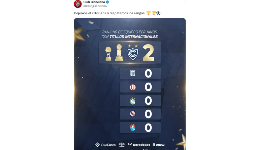 Cienciano es el único equipo de Perú que puede presumir en su vitrina de trofeos internacionales, de ahí que, uso su cuenta oficial para pedir que “Respeten los rangos” mostrando que tiene 2 títulos internacionales, una Copa Sudamericana y una Recopa, mientras Alianza tiene 0.