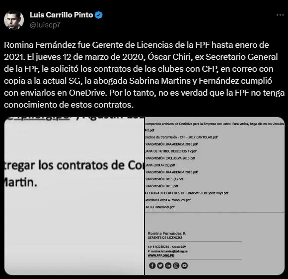 Mediante su cuenta de Twitter comentó lo siguiente: “Romina Fernández fue Gerente de Licencias de la FPF hasta enero de 2021. El jueves 12 de marzo de 2020, Óscar Chiri, ex Secretario General de la FPF, le solicitó los contratos de los clubes con CFP, en correo, con copia a la actual SG”.