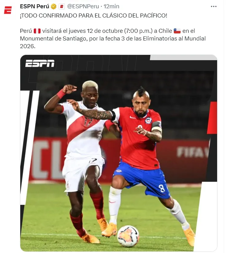 En ese sentido, el duelo entre Perú y Chile se desarrollará el jueves 12 de octubre a las 7:00 PM.
